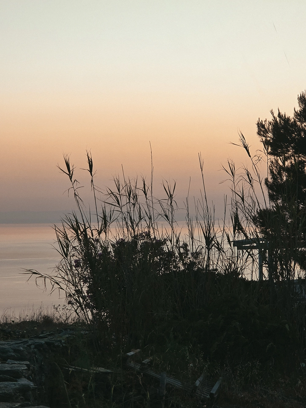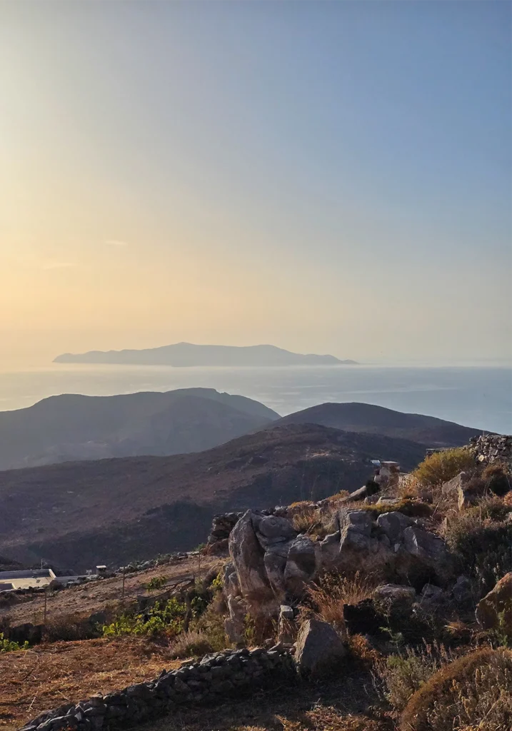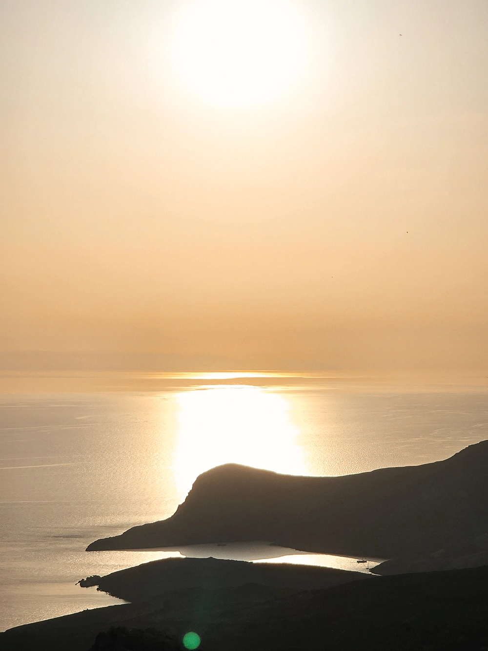 Zum einen wegen der Aussicht: Von der Terrasse aus hat man einen atemberaubenden Blick über die Ägäis, und wenn die Sonne untergeht, färbt sich der Himmel in Gold- und Rottönen – ein echtes Naturkino.